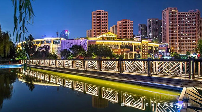 還有一些橋梁是屬于景區(qū)中的造景橋梁,例如棧道橋、玻璃橋或者是湖心橋,這類橋梁有木質(zhì)或玻璃質(zhì)地,再以燈光造景,來達到曲徑通幽之感,達到白天有景,夜間有色,景色合一的境界。通過以上的幾種橋梁亮化介紹,我們發(fā)現(xiàn)只有人參與進來的時候,橋梁的這種夜間美,才會被渲染到更大的程度,通過各種媒體渠道的傳播,橋梁的知名度也就有所提升,增加地區(qū)范圍內(nèi)的網(wǎng)紅造勢。