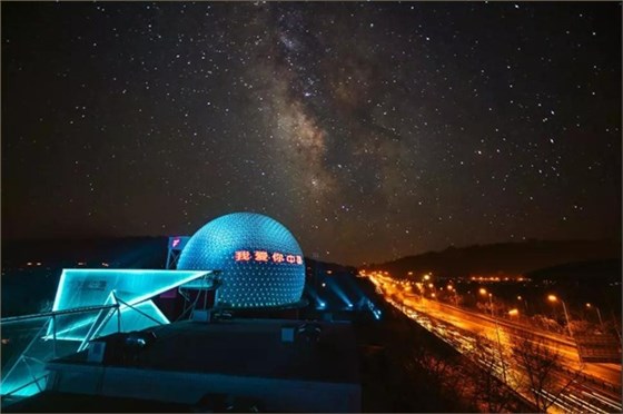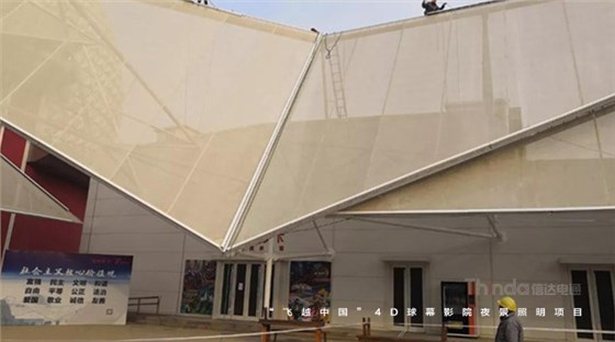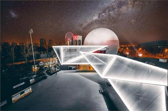 影院高32.8米,總占地總面積3600平方米。外觀的球形頂,代表著神秘浩瀚的宇宙和閃爍星空,神秘又等待著探索。外圍建筑狀似飛翼,采用的是鋼絲膜強(qiáng)化來建筑造型,展現(xiàn)建筑“飛躍”之勢(shì),正與“飛越中國(guó)”這一主題相契合!