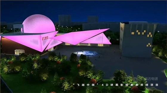 在光色的設(shè)計(jì)中,信達(dá)電通采用皓白、暖黃、科技藍(lán)等多種顏色漸變切換的設(shè)計(jì)手法。燈光重點(diǎn)勾繪外圍建筑輪廓,突出建筑的獨(dú)特結(jié)構(gòu),與球幕影院和廣場(chǎng)地面的投影形成互補(bǔ)和諧的夜景畫面。