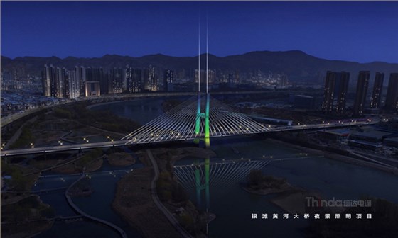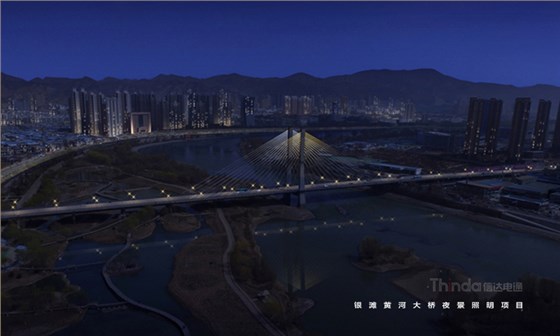 銀灘黃河大橋是蘭州市城市交通樞紐工程,北通蘭州中川國際機場,南達蘭州北站。信達電通在夜景亮化設計中以功能性、裝飾性照明為主,同時也避免高亮度、多光色對行車造成安全隱患。橋身和纜繩的彩光使得大橋成為夜間最獨特的風景。