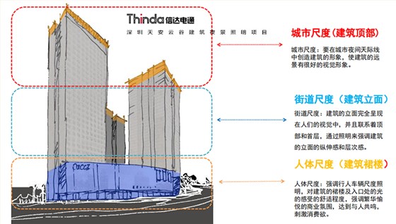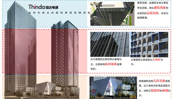深圳天安云谷夜景照明建筑本身由建筑主體元素延伸至頂部,突出建筑高度和在夜間的遠(yuǎn)觀效果,材質(zhì)為玻璃幕墻。辦公樓建筑立面材質(zhì)為玻璃為主,立面結(jié)構(gòu)縱向延展性好。
