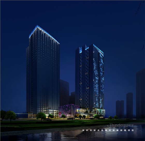深圳天安云谷建筑夜景照明的建筑為組團(tuán)式建筑群,建筑功能包括辦公、公寓、配套商業(yè)、幼兒園等。高層建筑以地塊西側(cè)的景觀水軸為界面進(jìn)行展開,充分利用景觀資源優(yōu)勢,同時(shí)避免相互視線干擾。底部的小量體商業(yè)順應(yīng)景觀水軸走勢布置,營造出獨(dú)特的商業(yè)氣氛。