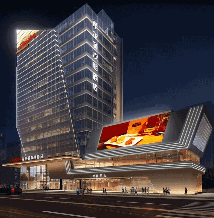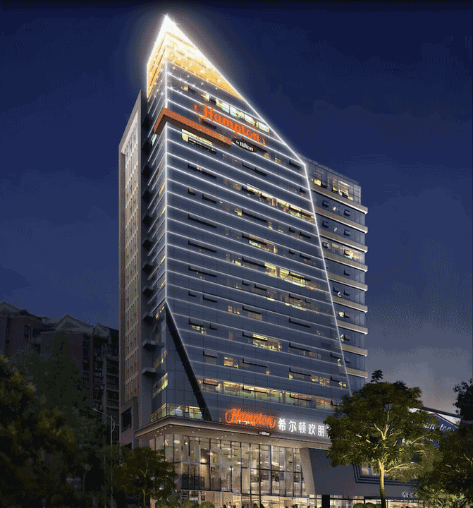 都江堰希爾頓歡朋酒店是一座以希爾頓為主題品牌的高端酒店,信達電通對其進行整體夜景照明設計。