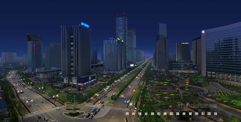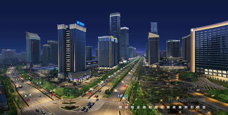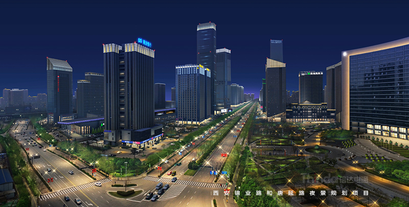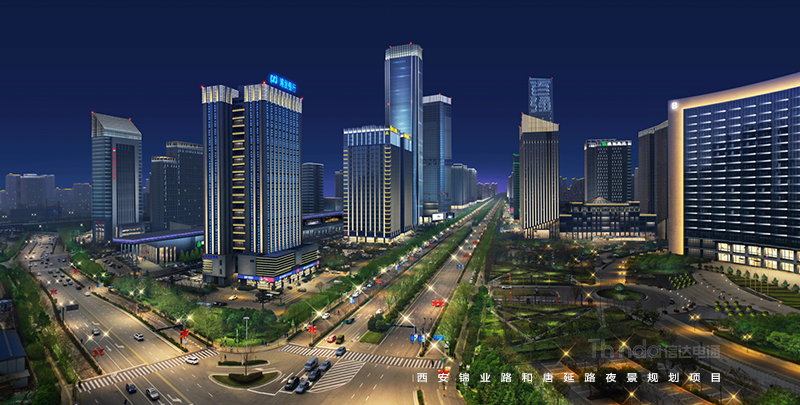本項(xiàng)為西安高新區(qū)建筑景觀照明規(guī)劃設(shè)計(jì)中的一部分,地處于唐延路南與錦業(yè)路東交叉口,該視角可見建筑有都市之門、浦發(fā)銀行、綠地智海大廈、綠地筆克國際會展中心、陜西煤業(yè)化工集團(tuán)、領(lǐng)海大廈、中鐵航空港假日酒店等,是高新區(qū)錦業(yè)路南端的重要位置,當(dāng)車輛、行人抵達(dá)該位置時,視角寬闊夜晚可視范圍大,夜幕下的燈光也就更為重要。