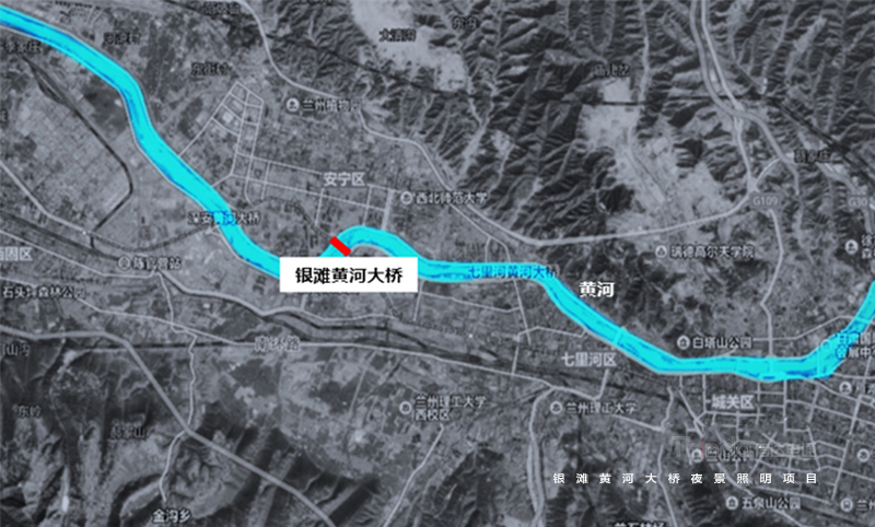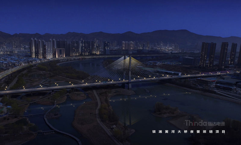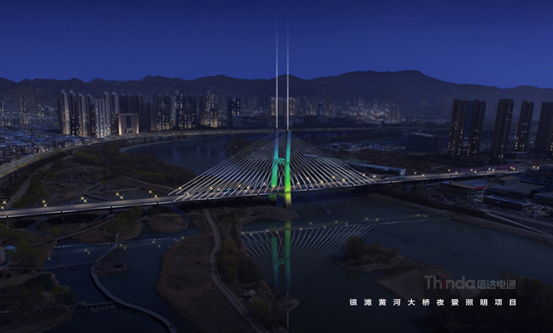 銀灘黃河大橋是蘭州市城市交通樞紐工程,北通蘭州中川國際機場,南達蘭州北站。信達在夜景亮化設計中以功能性、裝飾性照明為主,同時也避免高亮度、多光色對行車造成安全隱患。橋身和纜繩的彩光使得大橋成為夜間最獨特的風景。