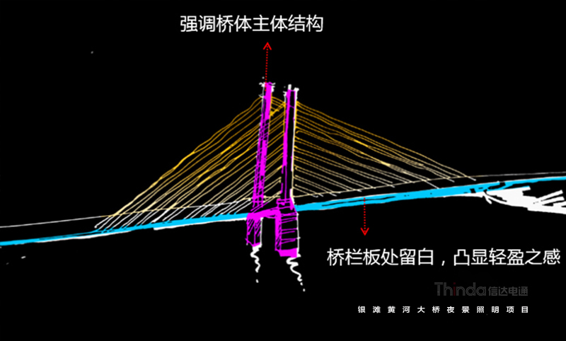 銀灘黃河大橋夜景亮化設計中我們以功能性、裝飾性照明為主,同時也避免高亮度、多光色對行車造成安全隱患。