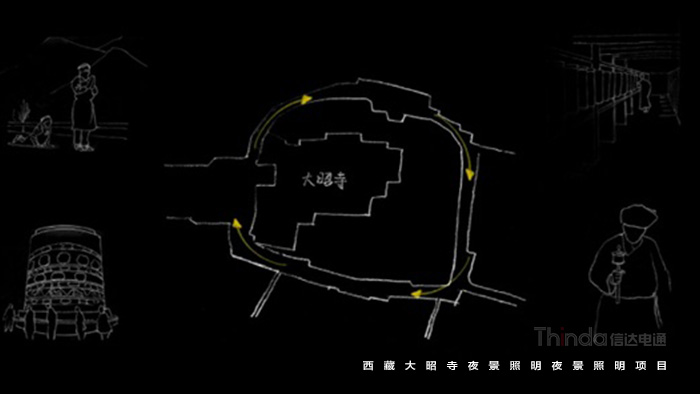 3)重大節日模式下所有照明燈具全開,重要節點投影經文開啟,使大昭寺成為一個巨大的轉經筒與朝拜的人一起緩緩轉動。