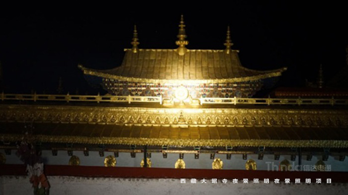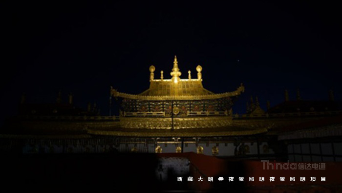 大昭寺是四層樓的碉堡式建筑結構,各殿宇樓頂形狀高低不一,為全面營造金頂的夜間氛圍,信達科技采用投光燈投射金頂的設計方案。投光燈分布在圍繞大昭寺的十個點位上,根據被照物高度、角度設置燈具數量、高度、角度、方向,以實現金頂的整體亮度統一。