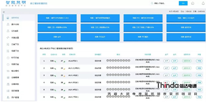 大昭寺的整體照明控制采用信達科技自主研發的鼎立慧聯智能控制系統??刂葡到y采用手動、時間經緯度、4G智能照明等控制方式,控制模式分為節能、平日、節日三種模式,總控制室設定在管委會樓頂景觀照明控制室。大昭寺四周所有投光燈具使用DALI調光控制系統,主控設備具有RS485擴展接口,同時系統可通過電腦圖形化界面對所有的燈光進行集中控制監視。